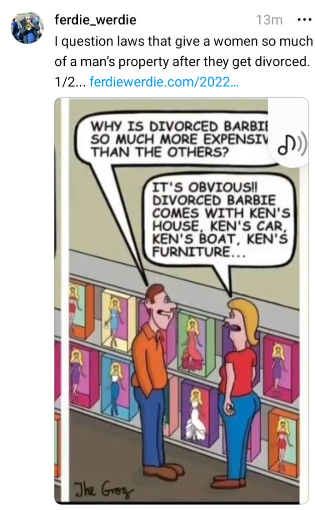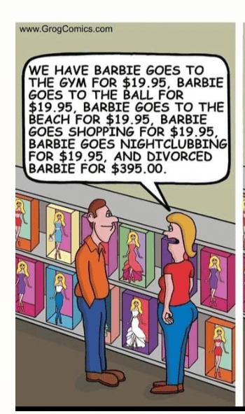 This cartoon below makes me wonder if some laws in the United States should not be changed. I just question laws that give women so much of a man’s property after they get divorced. I hear occasionally that men do get half from a woman if she is more wealthy than he is.