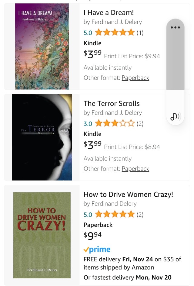 His books are: I HAVE A DREAM, THE TERROR SCROLLS and DRIVING WOMEN CRAZY Mystery Publication Date: Mar-2002